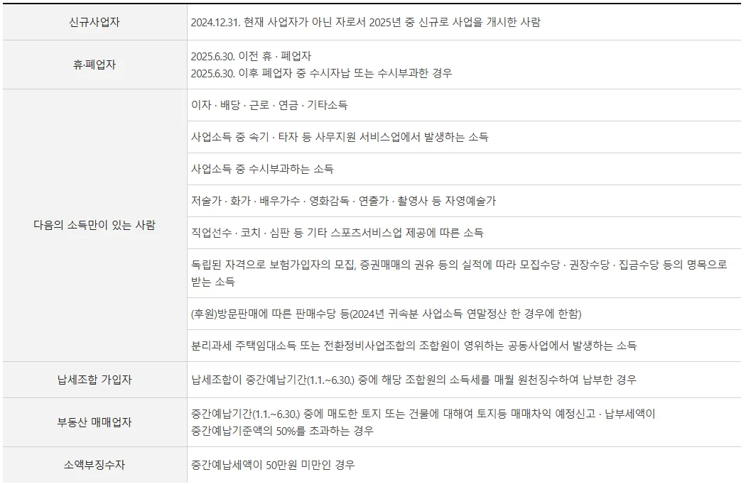 단, 올해 신규로 사업을 개시한 신규사업자나 2025년 6월 30일 이전 휴·폐업자, 중간예납세액이 50만 원 미만인 경우 등은 중간예납 납부 대상에서 제외됩니다.